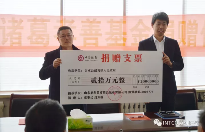 12月6日,山东dcbox小金库官网医疗用品股份有限公司(股票代码:300677)董事长刘方毅先生向革命老区沂水县诸葛镇捐赠孝善基金人民币20万元,助力诸葛镇政府孝善事业的运营和开展,董事长助理穆天雨代表公司参加捐赠仪式。